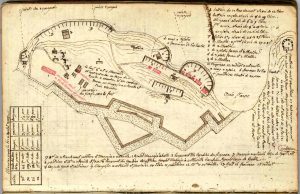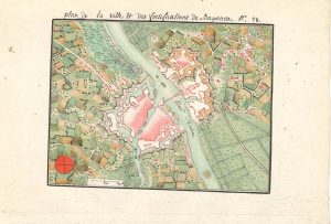 N° 217·FORTIFICATIONS. 4 plans manuscrits aquarellés, [fin XVIIIe siècle]. ; 12 x 9,5 cm sur 1 page …
