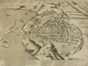 N° 290·Matheo FLORINI. Marsillia, vue à vol d’oiseau associée à un plan en élévation Gravure de …