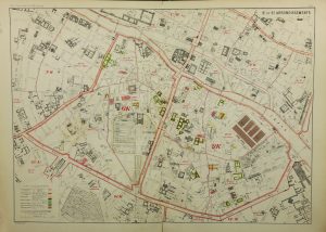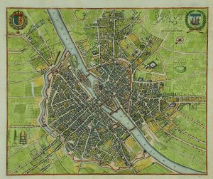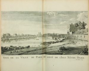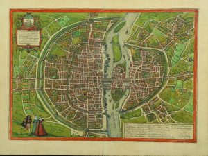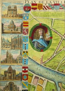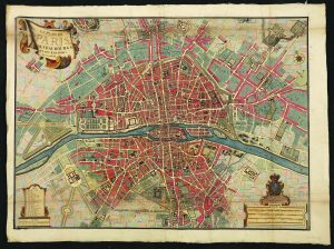 Citons parmi les pièces notables, l’Atlas de Jacoubet (1836) ; le Plan de Delagrive, comprenant également les environs de Paris, Versailles et Saint-Cloud (vers 1750), exemplaire colorié dans une reliure de l’époque en veau blond ; le Plan dit de Turgot, dressé par Louis Bretez (1739), relié en maroquin rouge aux armes de la ville de Paris ; le Plan de Verniquet (An iv), fidèle reflet du Paris de la Révolution. L’on y trouve les principaux jalons de la cartographie de la capitale, du plan paru dans la Cosmographie de Münster vers 1570 et montrant l’état de la ville vers 1530, aux représentations du Paris remodelé du baron Haussmann, et jusqu’à la naissance du métropolitain. etc…