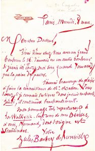 N° 14·Jules BARBEY d’AUREVILLY. 1808-1889. Écrivain, dandy. L.A.S. au docteur (Cazalis). Paris, …
