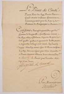N° 56·CHÂTEAU DE CHANTILLY (OISE) . 1702 – Pièce signée “HENRY JULES DE BOURBON” Prince de …