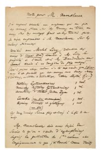 Livres anciens et modernes. Manuscrits. lettres autographes, Affiches. État général des troupes qui servent Sa Majesté très chrétienne Louis XVI (1785). Important ensemble d’archives relatives au château du Bois (Saint-Genest-Malifaux). [Cartes et plans] Ensemble exceptionnel de 10 plans manuscrits et aquarellés provenant du Château du BOIS. Charles BAUDELAIRE. 1821-1867 «Note pour M. Namslauer». S.l.n.d. (circa 1863). 2 pp. sur double feuillet in-folio. Important memento à son banquier. LE MASSON du PARC Pesche & Chasse des oiseaux de mer. A Dieppe 1721. Redouté/Jean-Jacques ROUSSEAU La Botanique de J.J. Rousseau, ornée de soixante-cinq planches, imprimées en couleurs… Miro / BRETON (André) La Clé des Champs. Paris, Éditions du Sagittaire, 1953. Manet / MALLARME (Stéphane) L’Après-midi d’un faune. Eglogue avec frontispice, fleurons & cul-de-lampe. Paris, AlphonsenDerenne, 1876…. etc…