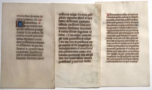 N° 3·ENLUMINURES du XVe Siècle. 3 pages calligraphiées et enluminées du XVe s. Lettrine ornée et …
