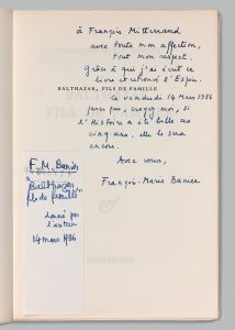 La vente aux enchères de la bibliothèque d’un Président de la République est un événement inédit et spectaculaire. Il s’agit d’un ensemble de plus de 1000 ouvrages de littérature du XXe siècle, la plupart en édition originale et pour certains reliés par Danielle Mitterrand ou par les meilleurs praticiens de la seconde moitié du XXe siècle. Au centre de cette vente, un ensemble de manuscrits jette un jour nouveau sur la personnalité de l’homme d’État. François Mitterrand a été bibliophile. Il aimait les exemplaires sur grands papiers et les reliures. Il était connu pour arpenter les librairies et dévorer les catalogues de libraires. Il s’échappait ainsi des dures réalités politiques par ses fameuses promenades littéraires dans le Quartier Latin. C’était l’une de ses parts les plus secrètes, la source spirituelle de son action. Il partage cette passion du livre rare avec Georges Pompidou, Dominique de Villepin, et, plus loin de nous, Louis Barthou. Sous l’Ancien Régime, certains Ministres célèbres ont collectionné les livres comme Jean-Baptiste Colbert, les cardinaux Richelieu et Mazarin.