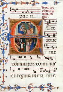 N° 845·INIZIALE 'E', ADORAZIONE DEI MAGI. Seconda metà del XIV secolo, Bologna.