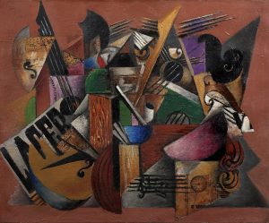 N° 214·SERGE FÉRAT (1881-1958). Nature morte, Lacerba, 1913. Huile sur toile et collage, signée en bas …
