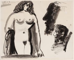 N° 232·PABLO PICASSO (1881-1973). Nu debout et profils, 29 mai 1967. Encre sur papier, signé et daté …