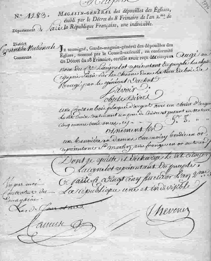 Récépissé du Magasin Général de dépouilles des Eglises (1794)