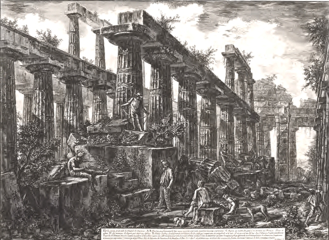 Vue des restes de la celle du temple de Neptune, planche XV de la suite Paestum, eau-forte, 50 x 68,5 cm (Ficacci 866) Paestum - Poseidonia en l'honneur du dieu grec de la mer Poséidon. Au 4ème siècle avant J-C, Poseidonia passe aux Lucaniens (branche locale de la tribu italique voisine des Samnites). En 273 avant J-C, les Romains prennent possession de la ville et l'appelle dorénavant Paestum. Temple connu sous le nom de "temple de Neptune" (environ 450 av. J.C.). Au 9ème siècle, Paestum est abandonnée en raison de nombreuses attaques des Sarrasins mais aussi d'un climat malsain (zone paludéenne). Entourée de marais alimentés par la présence du fleuve Sele, la ville est progressivement engloutie. Elle sera oubliée pendant environ 900 ans. Grâce à des travaux routiers en 1748, les temples remarquablement préservés sont redécouverts et fouillés. |