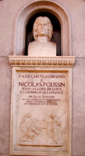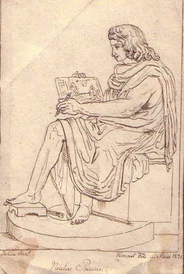 POUSSIN, Nicolas (1594-1665). Peintre français, fondateur de la peinture classique française du XVIIe siècle. Son uvre symbolise les vertus de la Logique, de l'Ordre et de la Clarté et a influencé l'évolution de l'art français jusqu'à nos jours. Il y réalise ses plus grandes oeuvres : 'Le martyre de Saint-Erasme' pour la basilique Saint-Pierre, 'L'enlèvement des Sabines'... Traitant de sujets le plus souvent historiques et religieux. D'origine paysanne, Nicolas Poussin est né près des Andelys, en Normandie. Il étudia la peinture à Paris et peut-être aussi à Rouen. En 1624, il vint à Rome où il passa le reste de sa vie, à l'exception d'un séjour à Paris de 1640 à 1642. Il meurt à Rome, le 19 novembre 1665, et fut inhumé dans l'église de Saint Lorenzo in Lucina, sa paroisse. |