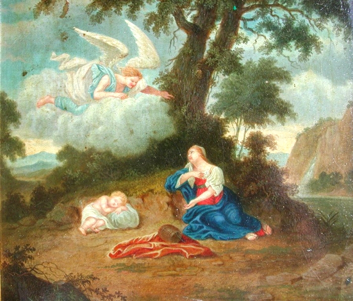 Sujet biblique est tiré de la Genèse (16, 1-16). A gauche, un ange apparaît à Agar, et lui montre une source cachée au milieu d'arbres et de rochers. |