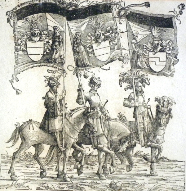 Triomphe à la gloire impériale (planches, gravée en 1515-1519) Cheval ; roi ; couronne ; sceptre ; animal ; harnais ; écu ; armoiries ; habit ; manteau ; chapeau ; plume ; caparaçon ; ornement ; rinceau ; feuille. Technique : Gravure sur bois. Fait partie du recueil `Généalogie de l'empereur Maximilien I`, suite de 77 estampes |