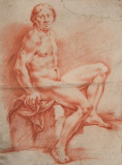 Dessin Sanguine. Belle Académie. Etude de Nu. de la 2me moitié du XVIIIe siècle. Une inscription en crayon, verso, donne l'oeuvre à "Diotti". |