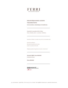BIBLIOTHÈQUE MARCEL LECOMTE TROISIÈME PARTIE Livres anciens, romantiques et modernes. Vendredi 22 novembre 2024 à 14h00 Drouot - Richelieu, salle 7 - 9, rue Drouot - 75009 Paris Exposition à l’Étude, sur rendez-vous, du 12 au 15 novembre 2024 Expositions publiques : Mercredi 20 novembre de 11h à 18h, Jeudi 21 novembre de 11h à 20h Téléphone pendant l’exposition et la vente : 01 48 00 20 07 Alexandre FERRI - Bruno MAUVAIS Commissaires-Priseurs Olivier BRICARD 53, rue Vivienne - 75002 Paris - Tél. 01 42 33 11 24 - E-mail : ferri.cp@ferri-drouot.com - www.ferri-drouot.com Ventes aux Enchères et Expertises