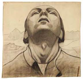 Carboncino mm 375x390. Firmato e datato a penna in basso a sinistra. Al retro abbozzo di busto e di mano. Ispirato