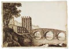 Paesaggio con torre e ponte.