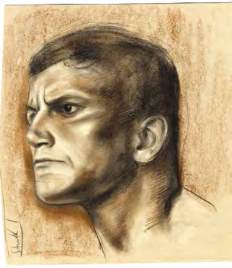 Pastello nero e marrone; carta avana. mm 320x290. Iscritto