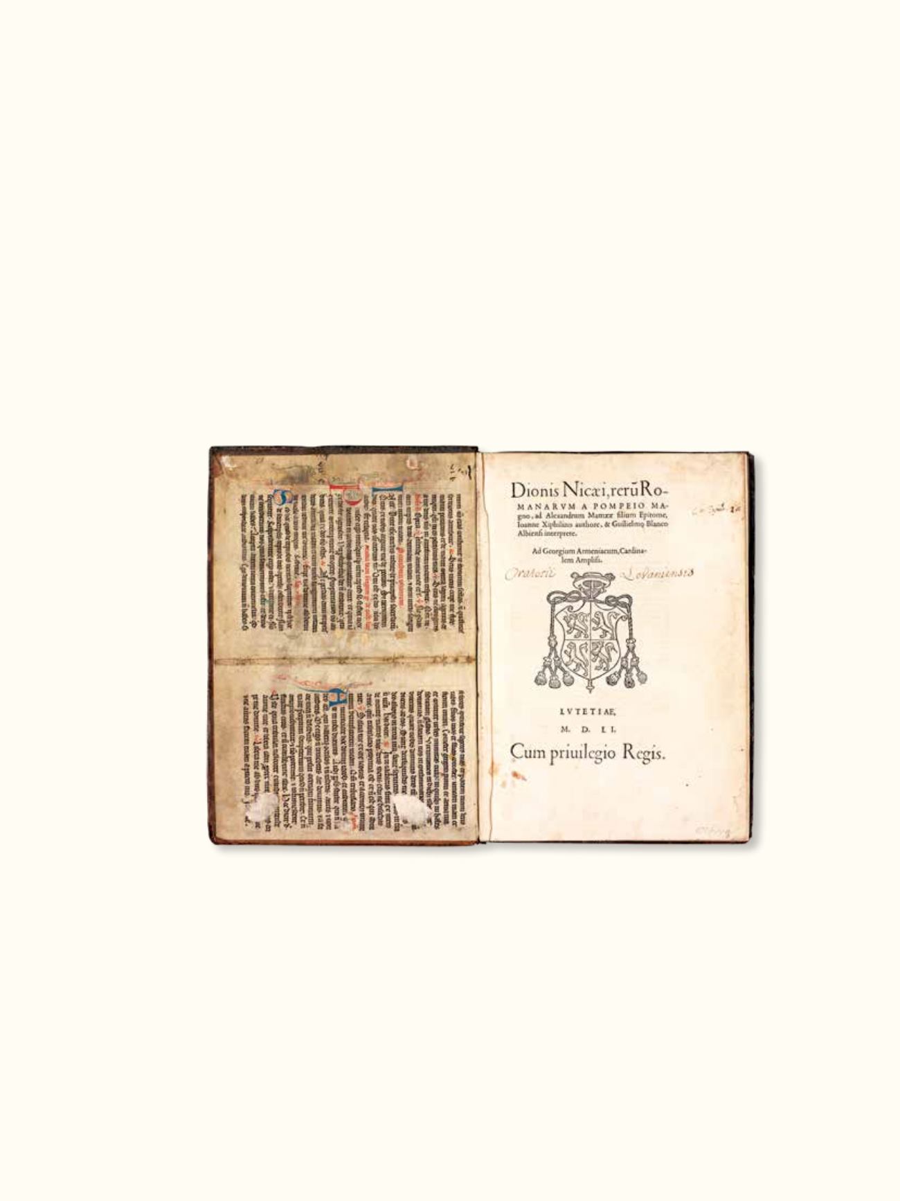 Un des exemplaires ornés sur le titre des armes du cardinal Georges d’Armagnac, dédicataire de l’édition, en lieu et