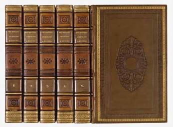 Six volumes in-8, veau glacé olive, dos à nerfs ornés de roulettes dorées et de fleurons à froid,