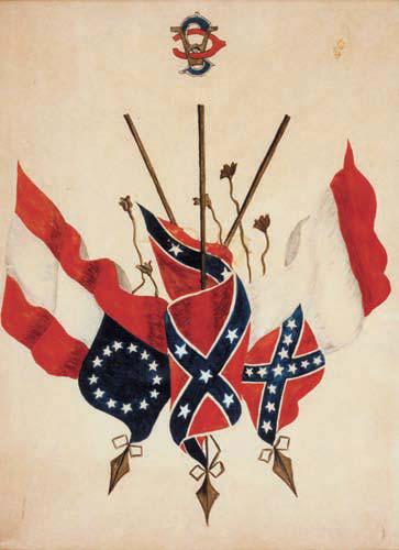 2) Deux sous-verre contenant cinq billets de banque originaux émis entre 1861 et 1864 par les autorités locales : The City of Richmond (10 cts), The Bank of the State of Georgia (50 cts), The Confederate States of America (20, 50 et 500 $ ; portrait en buste du président Jefferson Davis sur le billet de 50 $). Chaque billet est signé de la main d’un « Treasurer » ou d’un « Cashier ».