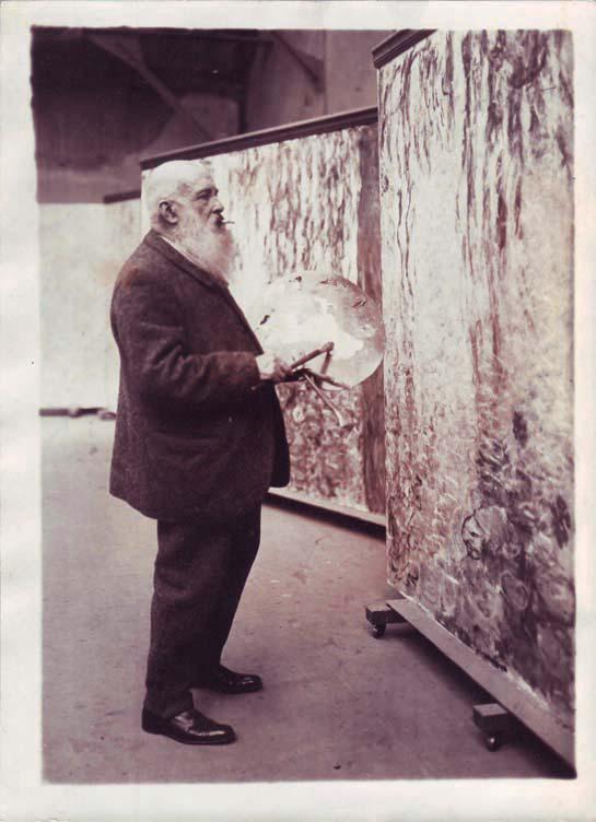 Belle photographie en pied de l’artiste dans son atelier, peignant les nymphéas. Tirage de l’ Agence Meurisse , datant de l’époque de la mort du peintre en 1926, avec texte explicatif au dos. 18 x 13 cm.