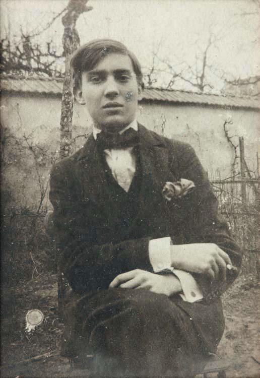 Rare petite photographie originale, sous verre (13 x 10 cm), montrant le jeune homme très élégamment vêtu, assis dans un jardin. Légères imperfections. Au dos du cadre, précisions écrites par différentes mains, dont celle de Julien Green : « Raymond Radiguet à seize ans (1918) chez ses parents au jardin (Donné par Jean [Cocteau] au ‘Bœuf sur le toit’ ) – Coll. J. Green ». Quelques mots ont été grattés.