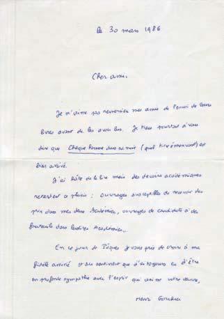 Une vingtaine de missives de Henri Gouhier, rédigées de sa petite écriture entre le 18 octobre 1979 et le 11 décembre 1991 accompagnent pas à pas l’œuvre littéraire de Julien Green. En octobre 1979, alors que Gouhier vient d’entrer à l’Académie française, il écrit à son confrère : « … J’ai lu avec émotion votre correspondance avec Maritain. J’ai connu Maritain en 1922… J’avais été frappé par la différence entre l’auteur de livres écrits sur un ton impératif et l’ homme à l’esprit ouvert, généreux, accueillant…Vous avez fait une bonne action…Vous avez, de plus, atteint le but que vous vous proposez : faire connaître Maritain vivant… », etc. Beaux commentaires des ouvrages de Green : Frère François , Chaque homme dans sa nuit , Liberté chérie , Villes , La nuit des fantômes , Etoiles du Sud , L’autre sommeil , le Journal , la nouvelle édition de Moïra , L’Expatrié , etc.