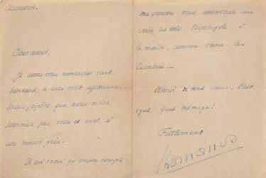 « … Après avoir relu ces cent pages du Voyageur sur la terre, – écrit Bernanos dans sa lettre datée de Vesenex – on ne pense même plus à vous remercier d’une dédicace trop flatteuse, on ne veut que vous remercier de les avoir écrites. Quel pressentiment vous avez de la véritable solitude ! « Ne cherchez pas le royaume de Dieu, et le reste sera retiré par surcroît » écrivait admirablement Augustin Cochin… ». Quelques années plus tard, il remercie Green pour son mot affectueux avant d’ajouter : « … j’espère que nous n’en sommes pas, vous et moi, à un merci près. Il est vrai qu’entre temps ma femme vous attendait au coin du bois, l’espingole à la main, comme dans les Calabres…Quel ménage ! ... ».