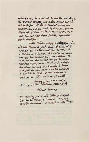 1) La minute autographe de la réponse que Green adressa à Camus le 3 avril (2 pages in-8) : « … J’attendais cette lettre sans savoir qu’elle me viendrait de vous. C’ était en effet ce que je ne pouvais pas espérer, mais je savais qu’un jour quelqu’un me parlerait, quelqu’un de plus grand que les autres… Cela ne me fait pas beaucoup souffrir de n’ être pas compris de la critique. Si mon œuvre vaut quelque chose, elle survivra aux coups… ce qui m’ importe surtout... c’est de dire ce que j’ai à dire… Je n’ai jamais cherché le succès… J’ai toujours dit à mi-voix ce que j’ai dans le cœur, je ne peux crier. Je crois que vous devez savoir ce que je pense de vous, parce que je l’ai dit dans mon journal. Sur ce point je ne reviendrai pas, mais votre lettre m’a touché au meilleur du cœur… J’ai commencé une autre pièce… », etc.