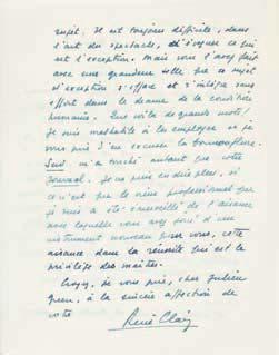 avec un sentiment de délivrance. Jeme suis sentimoins seul… ». Enoctobre 1954, RenéClair raconte un étrange rêve qu’il a fait : « …vous me parliez avec une sévérité surprenante d’un de vos confrères. J’ étais étonné et choqué. Etonné parce qu’une telle sévérité n’est pas dans votre caractère. Choqué parce que l’ écrivain dont vous parliez, je l’estime et je l’admire. Je puis vous dire son nom : c’est Julien Green. Mais le Julien Green avec qui je m’entretenais parlait de l’autre comme s’ il se fût agi d’une toute autre personne. Jugez de mon embarras, pris entre vous deux !... ». Il est encore question de Léviathan, porté à l’écran par le réalisateur Léonard Keigel, de l’Académie (« … on parle beaucoup de vous en ce moment… »), des scrupules de l’écrivain à accepter de prendre la nationalité française, etc.