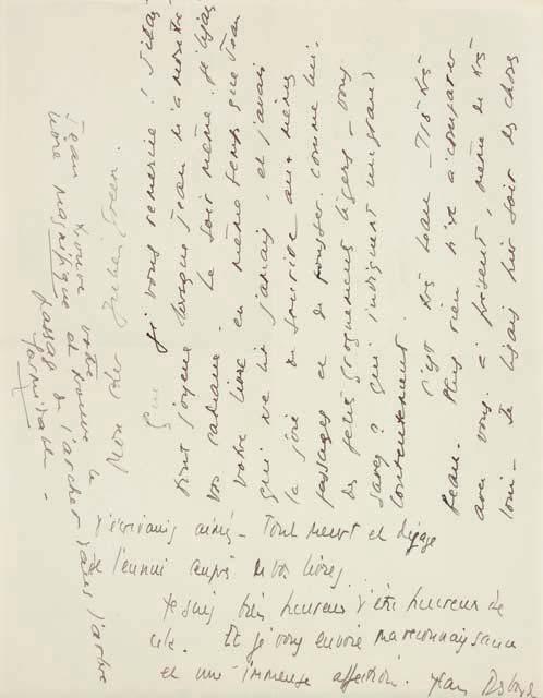 Lettre enthousiaste après la lecture d’ Adrienne Mesurat [voir texte partiel sous le n° 18], roman publié en 1930 – Deux longues missives (de la même année) citant entre autres Jacques Maritain et Les Clefs de la mort , et faisant vraisemblablement allusion au film que s’apprête à réaliser Jean Cocteau, Le Sang d’un poète , dont il vient de lire les épreuves et à propos duquel il espère que Green écrira un article dans les Nouvelles Littéraires . – Mort de Sandy Kessel en 1928, l’amour absolu de l’auteur du Lion (« …j’ai passé des jours atroces à cause de nouvelles tristes, de mon devoir amical auprès de Kessel… la pauvre petite… Si ce n’est pas la fin du monde (à quoi cela ressemble). Voyons-nous et consolons-nous un