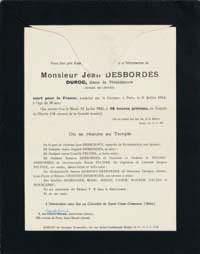 On joint un exemplaire de l’émouvant avis de décès de Desbordes adressé à Green (enveloppe) : « Vous êtes prié d’assister aux Service, Convoi et Inhumation de Monsieur Jean Desbordes, Duroc, dans la Résistance, Homme de Lettres, mort pour la France, assassiné par la Gestapo, à Paris, le 6 juillet 1944, à l ’ âge de 38 ans ; Qui auront lieu le mardi 31 Juillet 1945… », etc.