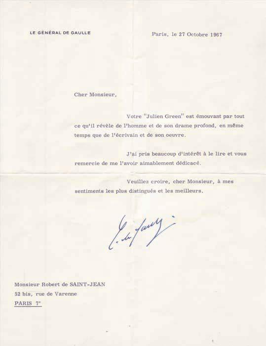 Lettre de remerciements adressée à Robert de Saint Jean qui lui avait offert son ouvrage Julien Green par lui-même , publié aux Editions du Seuil. « … Votre Julien Green est émouvant par tout ce qu’ il révèle de l’ homme et de son drame profond, en même temps que de l’ écrivain et de son œuvre. J’ai pris beaucoup d’ intérêt à le lire et vous remercie de me l’avoir aimablement dédicacé… ». Joint : Carte imprimée au nom du « Général de Gaulle, Président de la République et Madame de Gaulle », priant « Monsieur Julien Green, Homme de Lettres » de leur faire l’honneur d’assister à une réception de personnalités des Arts et des Lettres, qui sera donnée au Palais de l’Elysée (12° obl. ; 1967. Enveloppe).