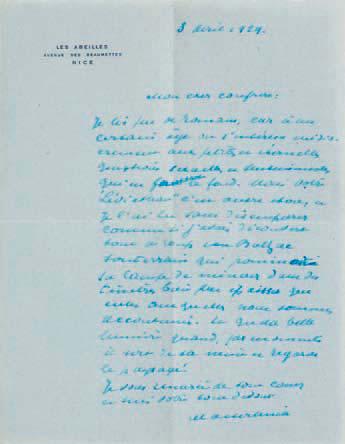 Lettre autographe signée, 1 page in-4 ; Nice, 3 avril 1929. Papier à son adresse. Enveloppe.
