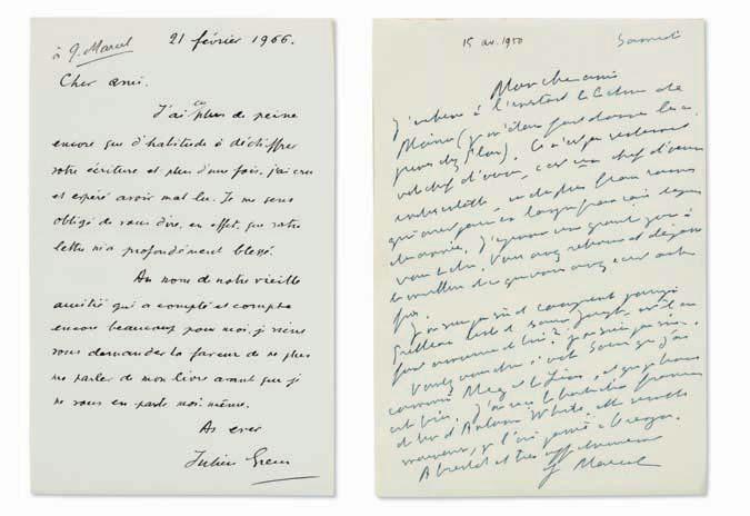 1) 6 brouillons autographes de lettres adressées par Julien Green à Gabriel Marcel (dont 4 signés et 1 tapuscrit), intéressants textes littéraires et amicaux (deux de février 1966, relatifs à un différend : « Au nom de notre vieille amitié qui a compté et compte encore beaucoup pour moi, je viens vous demander la faveur de ne plus me parler de mon livre [Terre Lointaine] avant que je ne vous en parle moi-même » ; « que voulez-vous que je vous pardonne ? Votre sincérité ?... Non, ce qui m’a heurté c’est qu’alors que le sort de mon livre était encore très incertain, vous ayez cru bon de me dire que je n’aurais pas dû le faire paraître. Le moment était mal choisi. Il fallait me faire vos critiques plus tard… »). 2) Lettre signée de Jean-Marie Marcel, fils de G. M., à Green, le priant de bien vouloir participer à un colloque lors des manifestations organisées par la Bibliothèque Nationale à l’occasion du centième anniversaire de la naissance de Gabriel Marcel.