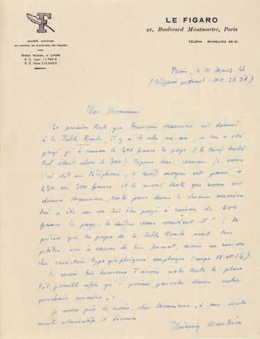 A propos du Journal 1940-1945, sur le point d’être publié, dont Maulnier sollicite quelques pages pour la revue La Table Ronde . Il promet les mêmes conditions accordées à Mauriac : « … Le premier texte que François Mauriac ait donné à la Table Ronde, il y a de cela un an, ne lui a été payé qu’ à raison de 400 francs la page… Depuis lors… le tarif moyen est passé à 450 ou 500 francs, et le second texte… 600… Je précise que les pages… sont très petites… ».