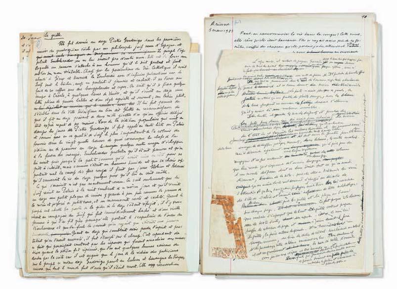 Manuscrit d’environ 250 pages in-4 ou in-folio, dont ca 160 autographes de J. G., le reste dactylographié et corrigé par endroits par l’auteur. Conservé dans une chemise de toile rouge vif avec pièce de titre en maroquin bordeaux sur le dos (« Julien Green – L’Apprenti psychiatre et autres histoires de vertige »). Etui assorti.