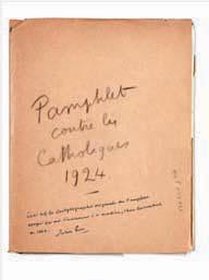 2) Epreuves originales, 51 pages in-12, portant en tête le bon à tirer « Très urgent » de Pierre Morhange, signé de ses initiales. Quelques corrections de sa main dans le texte. Conservé dans une chemise portant le message suivant de J. G. : « Mon cher Pierre [Morhange], Voici mon pamphlet. Lis le jusqu’ à la fin, même s’ il t’ennuie, et prends garde à son air terne ». Avec un des rares bandeaux publicitaires originaux de la première édition du Pamphlet portant ce texte imprimé en noir sur fond rouge : « Dédié aux six Cardinaux français – Prix : Deux francs ».