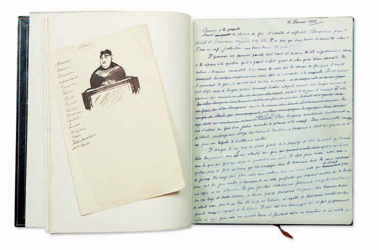 Ainsi qu’en témoigne à la fin la mention « 16 Janvier 1928 – 1 er Janvier 1929 », Green mit une année entière à composer ce qui est sans doute son vrai premier chef-d’œuvre, roman terrible et désespéré par lequel son auteur dissipe quelques fantômes et parvient à nous attacher à ses personnages dont il décrit les vies minuscules et les destins implacables, traquant le banal et le lamentable sans rien ajouter de mystérieux. Ce manuscrit de premier jet, à l’écriture agréable et fluide, garni d’impeccables lignes souvent raturées et corrigées, nous rappelle l’énergie et l’intransigeance de son auteur qui n’hésitait pas à retravailler inlassablement ses textes. Les dix pages reliées à la fin sont des corrections ou ajouts à apporter au manuscrit ; Green a noté en tête de chacune d’elles le numéro de la page concernée. Quant aux dessins, pour la plupart légendés, ils représentent une femme ronde à l’allure peu sympathique, dans différentes situations (on retrouve cinq d’entre eux reproduits dans l’Album de La Pléiade consacré à Julien Green).
