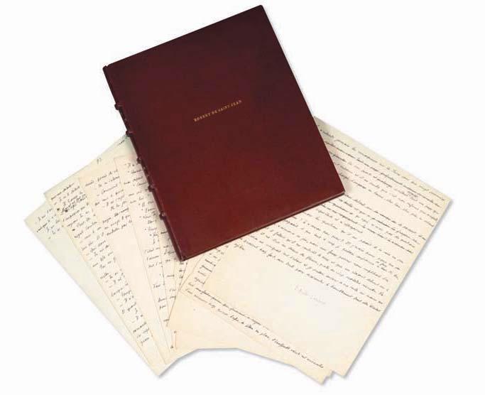 Manuscrit autographe daté à la fin « Paris, 15 Novembre 1929 – 29 Avril 1930 », environ 100 pages in-4 montées sur onglets dont 9 pages libres d’ajouts. Belle reliure en maroquin brun signée R. Bordes . Dos à cinq nerfs. Double filet doré sur les tranches. Plats intérieurs doublés de papier couleur rouille encadré d’un double filet doré. Robert de Saint Jean imprimé à l’or fin sur le premier plat. Auteur, titre et année « 1930 » en or sur le dos. Etui assorti recouvert de papier couleur rouille, bords en maroquin, intérieur en papier marbré.