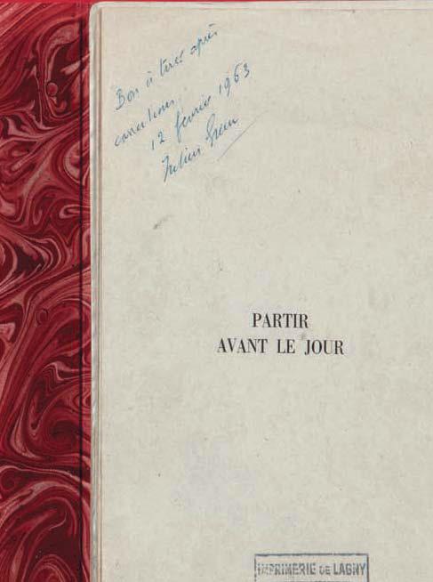 Placards très corrigés de la main de l’auteur qui donna son bon à tirer sur la page de titre (« Bon à tirer après corrections – 12 février 1963 – Julien Green »). En l’absence du manuscrit original, ces épreuves peuvent être considérées comme la première version de l’œuvre. L’ouvrage parut aux Editions Grasset en 1963. Dans l’intéressant texte joint, dactylographié après la publication de Partir avant le jour , Julien Green tente d’expliquer pourquoi il a écrit ce livre et quel rôle a joué sa mémoire dans ce récit de son enfance et de son adolescence. S’il avoue être incapable de rapporter les paroles comme les ayant entendues (« Je ne me rappelle pas vingt phrases que ma mère m’ait dites »), ses souvenirs lointains mis bout à bout ont donné le change ; quant aux rapports entre cette autobiographie et les méthodes psychanalytiques, il n’en voit pas, car : « … l’ homme qui se livre à un psychiatre… éprouve le besoin de guérir. Guérir n’ était pas mon propos. Guérir de quoi ? Je voulais seulement voir clair. Guérir l’enfant ou l’adolescent ? Ce qui me préoccupait, c’ était de comprendre l’enfant et l’adolescent que je fus… Il ne me paraît pas bon d’en savoir trop sur ce qui se passe en nous, parce que cela nous fait perdre le goût et le sens du mystère. Il n’est pas nécessaire d’ être horloger pour savoir lire l’ heure. Que derrière le cadran et les aiguilles, les rouages gardent leur secret, en ce qui me concerne ».