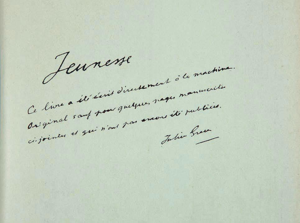 Quatrième volume de l’ Autobiographie , Jeunesse fut publié par Plon en mai 1974. Ce livre racontant le retour de l’Université de Green et les débuts de sa carrière d’écrivain, renferme des fragments en préface à diverses rééditions de ses premiers livres. Le dossier se compose de deux chemises portant les mentions suivantes : « Jeunesse – Ce livre a été écrit directement à la machine. Original sauf pour quelques pages manuscrites ci-jointes et qui n’ont pas encore été publiées », et « Double de Jeunesse – Variantes ». La première chemise renferme un manuscrit dactylographié par J. G., raturé et corrigé de sa main (214 pages numérotées) ; la seconde contient un tapuscrit d’une centaine de feuillets dactylographiés, également revu et corrigé par l’auteur. A cela s’ajoute une soixantaine de pages, dont une moitié autographes, intitulées « L’Autre Sommeil », « Léviathan – 1 ère version à garder : plus complète », etc., ainsi que d’autres feuillets annotés « Pages manuscrites non publiées ».