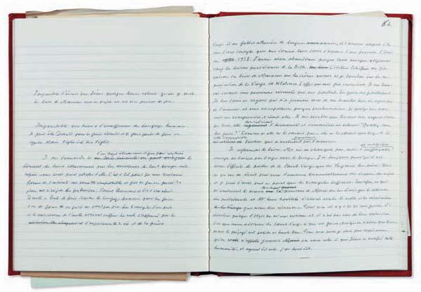 Manuscrit autographe de près de 100 pages in-4. Rédigé dans un carnet de toile rouge, conservé dans une chemise rigide habillée de papier marbré. Pièce de titre en cuir rouge : « Julien Green – Ce qu’ il faut d’amour à l’ homme… ». Etui assorti. Pièces jointes.