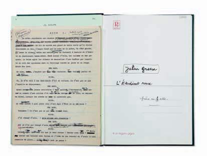 Manuscrit d’environ 90 pages in-4 + ca 45 pages tapuscrites dont quelques unes manuscrites, la plupart d’Eric Green sous la dictée de son père (sauf deux pages du dialogue de Moïra , qui sont de la main de Julien G.). Le tout conservé dans une chemise recouverte de papier marbré vert et rouge. Pièce de titre en maroquin rouge (« Julien Green – L’Etudiant roux »). Etui assorti.