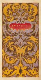 de volutes dorées aux angles et médaillon ovale au centre bordé de volutes