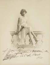 représentant la chanteuse et actrice Mistinguett assise sur une balustrade