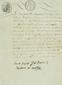 apostille autographe « bon pour quittance duchesse de Dantsig », Paris 4 octobre 1822 ; 1 page in-4 avec timbres
