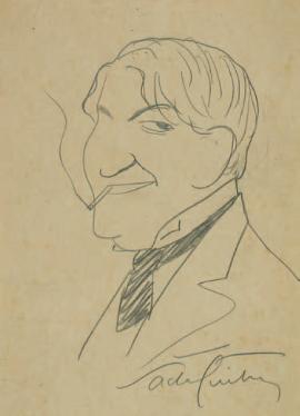 Autoportrait du jeune Guitry, cigarette aux lèvres, souriant. Ce dessin fut reproduit dans