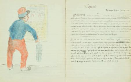 Magnifque cahier de devoirs enluminé de très nombreux et amusants dessins à la plume et en couleurs.