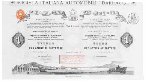 Titre d’une action au porteur, orné d’une belle vue de la baie de Naples avec le Vésuve et une automobile Darracq au premier